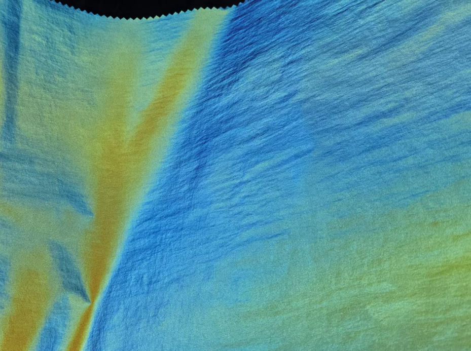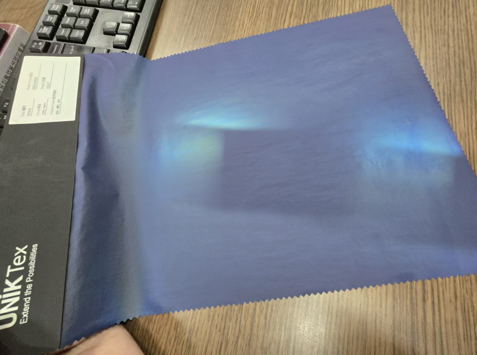 通过技术处理,具备炫彩、镭射、反光的视觉特性,面料呈现出绚丽的色彩变化与反光效果,视觉表现力强。